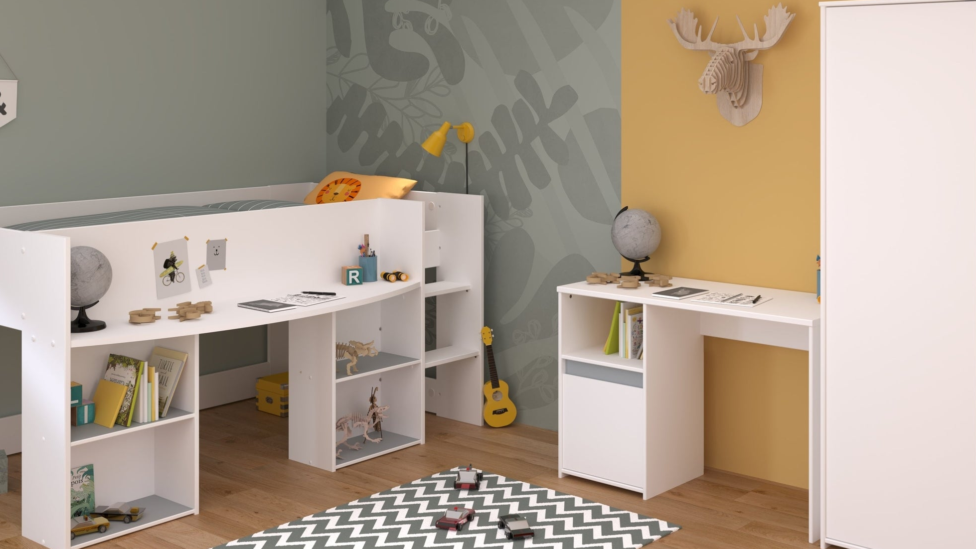 Parisot Parisot Hochbett Pirouette 1 - 90x200 mit integriertem Schreibtisch & Regalen – Weiß/Rosa oder Grau