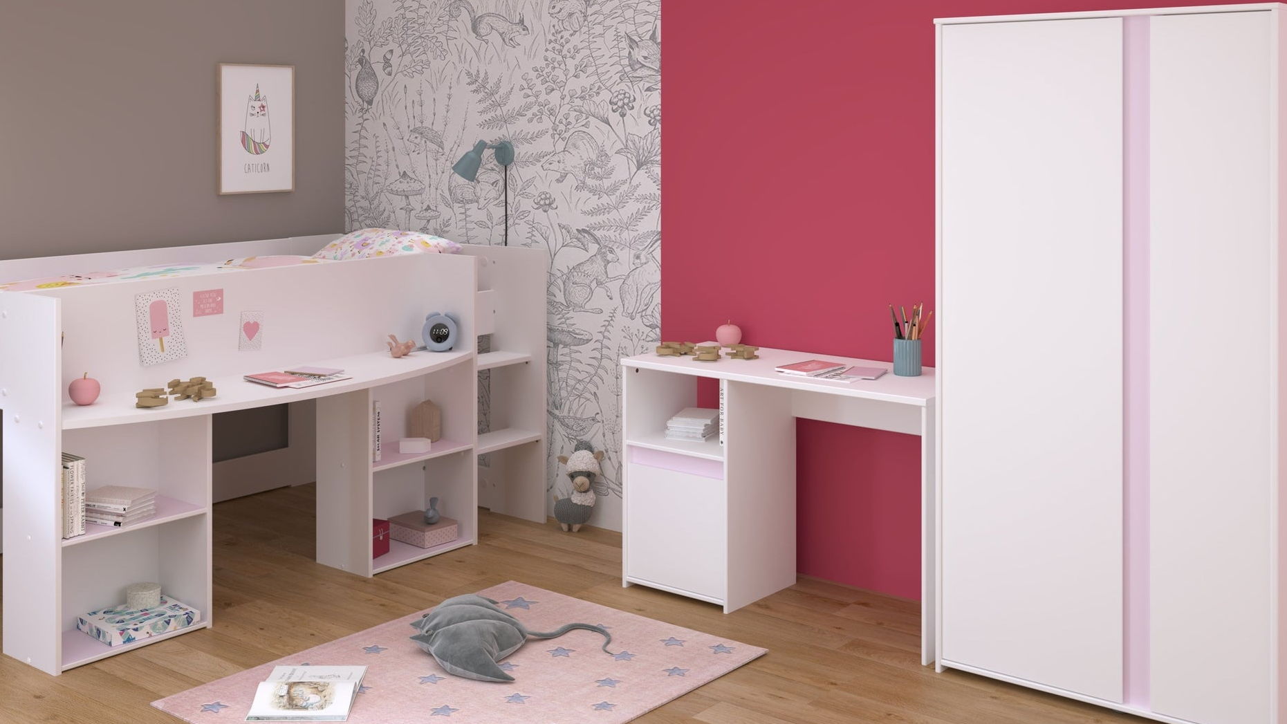 Parisot Parisot Kinderzimmer-Set Pirouette 13 – 3 tlg. Hochbett, Schreibtisch & Kleiderschrank in Weiß/Rosa oder Grau