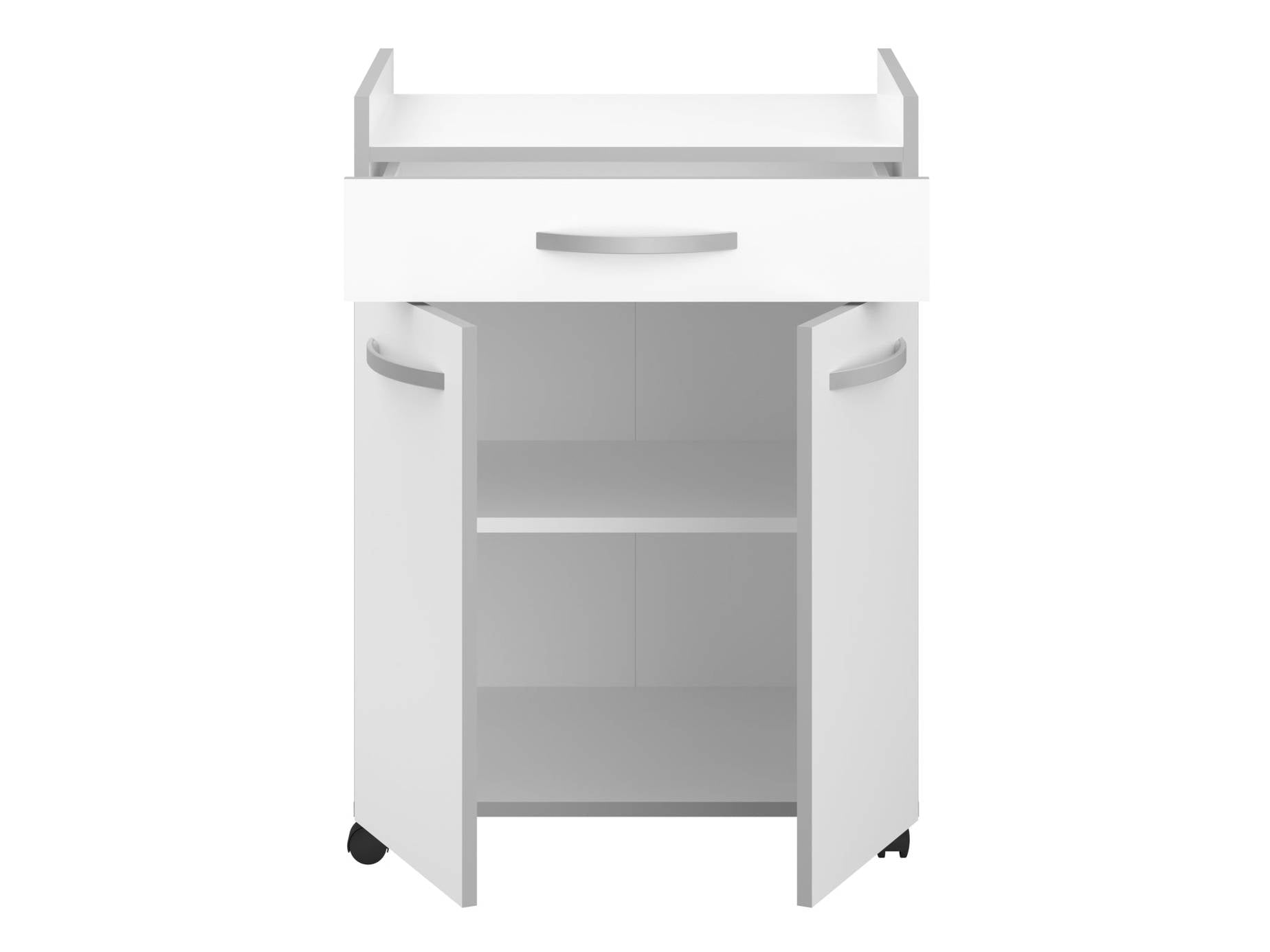 Mit großzügigen Fächern, einem Schubkasten auf Metallauszügen und praktischen Türen bietet dieses Buffet sowohl für die Küche als auch für das Esszimmer ideale Aufbewahrungsmöglichkeiten. Der Beistellschrank auf Rollen sorgt für zusätzliche Flexibilität und kann nach Belieben bewegt werden.