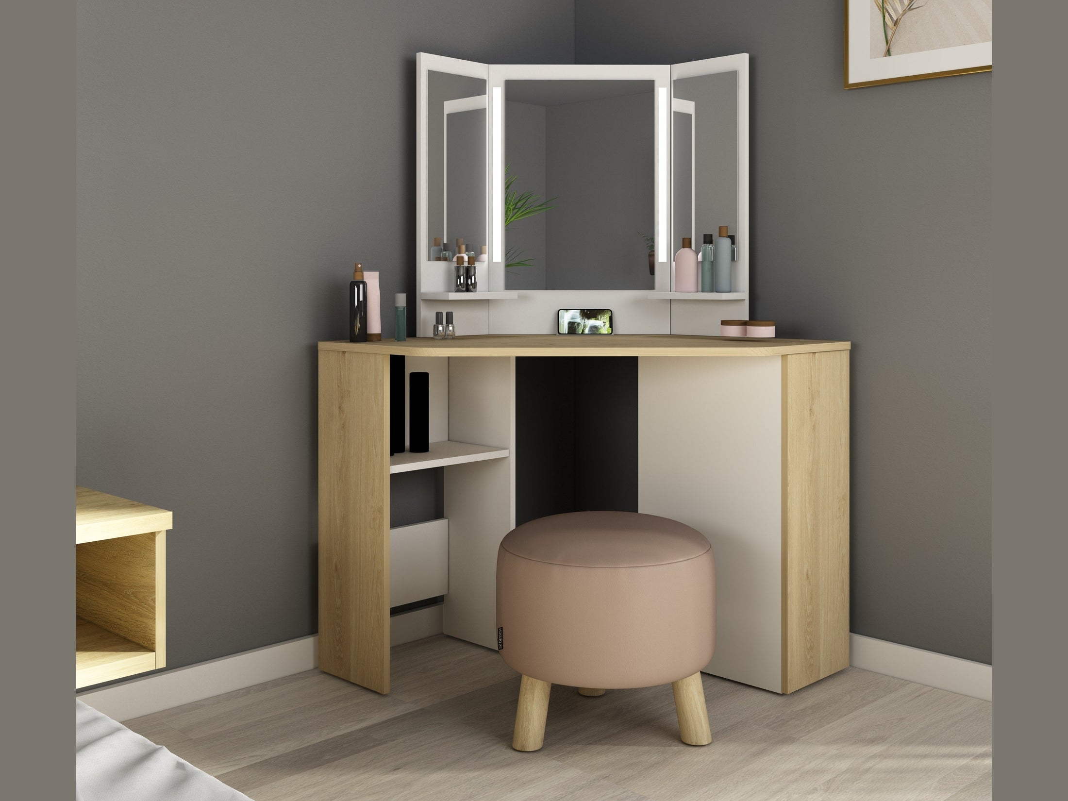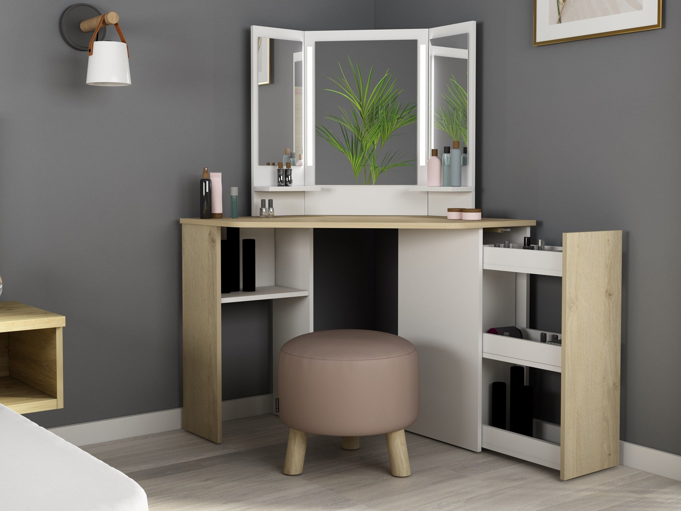 Der Schminktisch aus der Kollektion Chic wurde speziell für die platzsparende Nutzung in Raumecken entwickelt und schafft eine funktionale Styling-Ecke mit modernem Design. Durch seine Form passt er optimal in den Raumwinkel und nutzt vorhandenen Platz effizient aus.