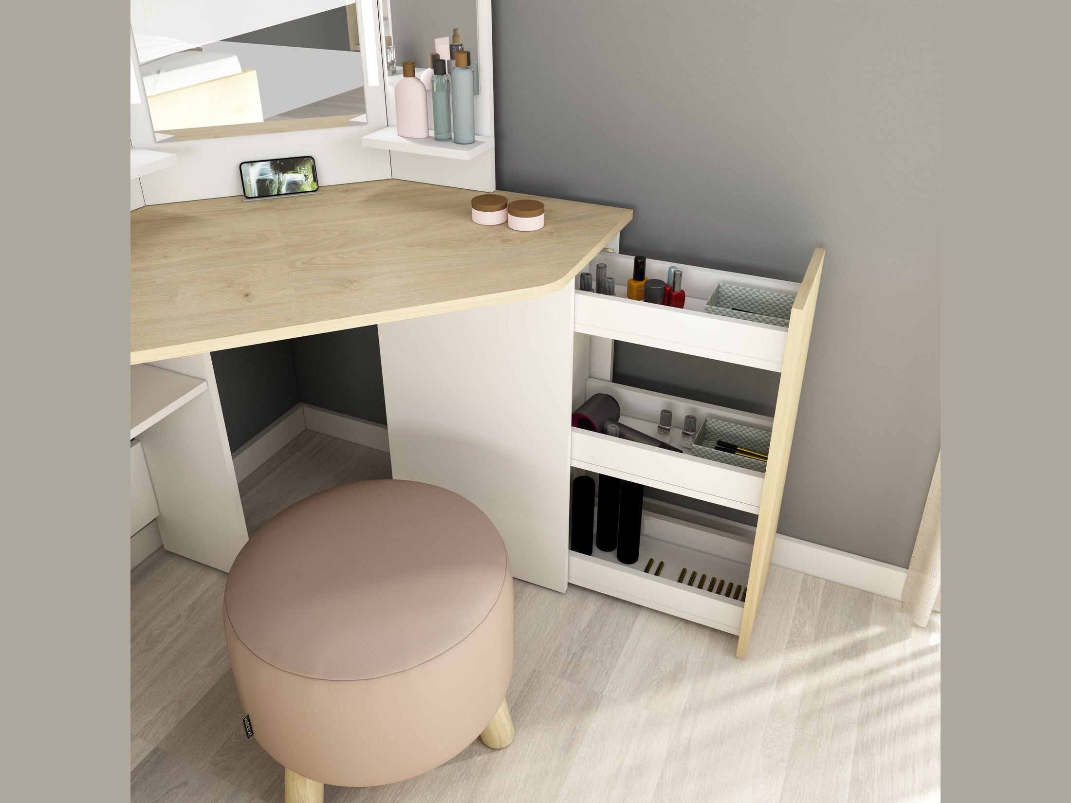 Der Schminktisch bietet großzügigen Stauraum. Zwei Ablageflächen im oberen Bereich sowie eine zusätzliche Ablage unter der Tischplatte bieten Platz für größere Produkte oder Dekoration. Rechts befindet sich eine ausziehbare Schublade auf Rollen mit drei Innenfächern und Push-Opening-System. Eine rutschfeste Leiste sorgt für sicheren Halt von Smartphone oder Tablet.