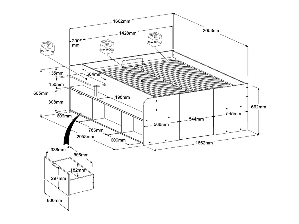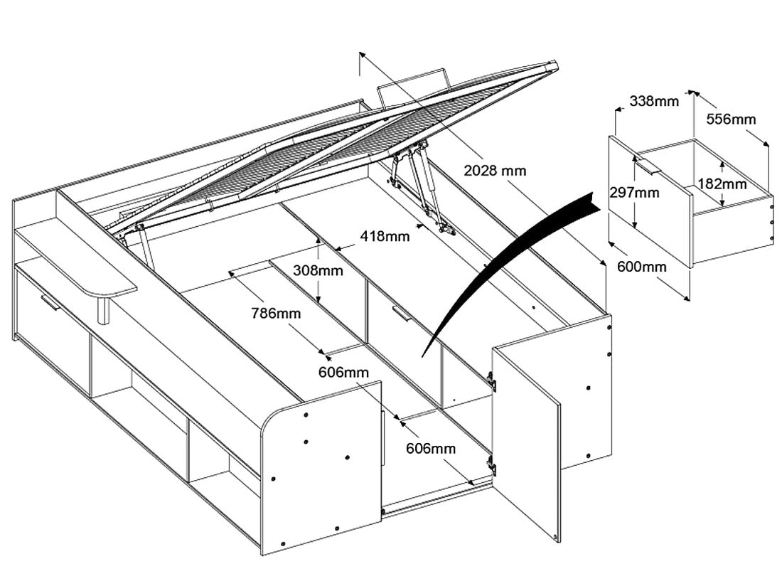 - Integrierte Regale, Stufen, Schubkästen & Fächer