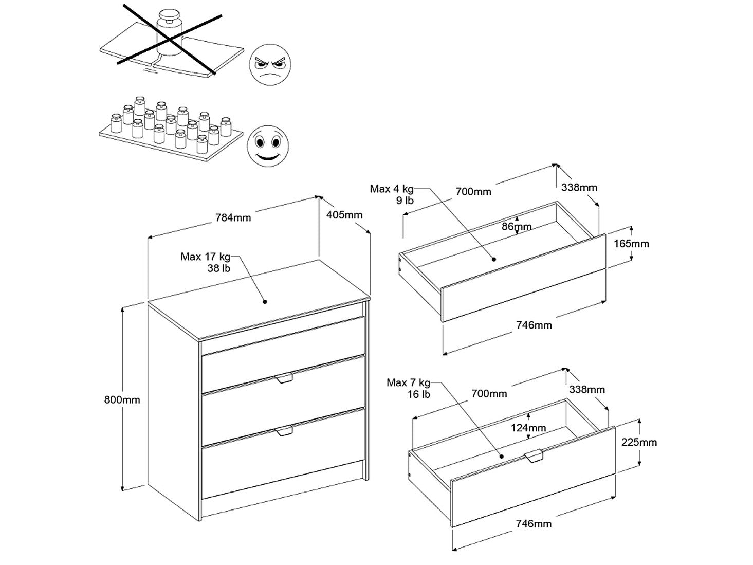 Für die nötige Ordnung sorgt der zweitürige Kleiderschrank (90 x 182 x 51 cm). Mit zwei Kleiderstangen, einer Ablage und vier seitlichen Fächern bietet er ausreichend Platz für Kleidung, Schuhe oder Schulmaterialien. Die Schubkastenkommode (79 x 80 x 41 cm) mit drei geräumigen Schubladen ergänzt das Stauraumangebot und eignet sich hervorragend für Unterwäsche, Spielsachen oder Bücher.