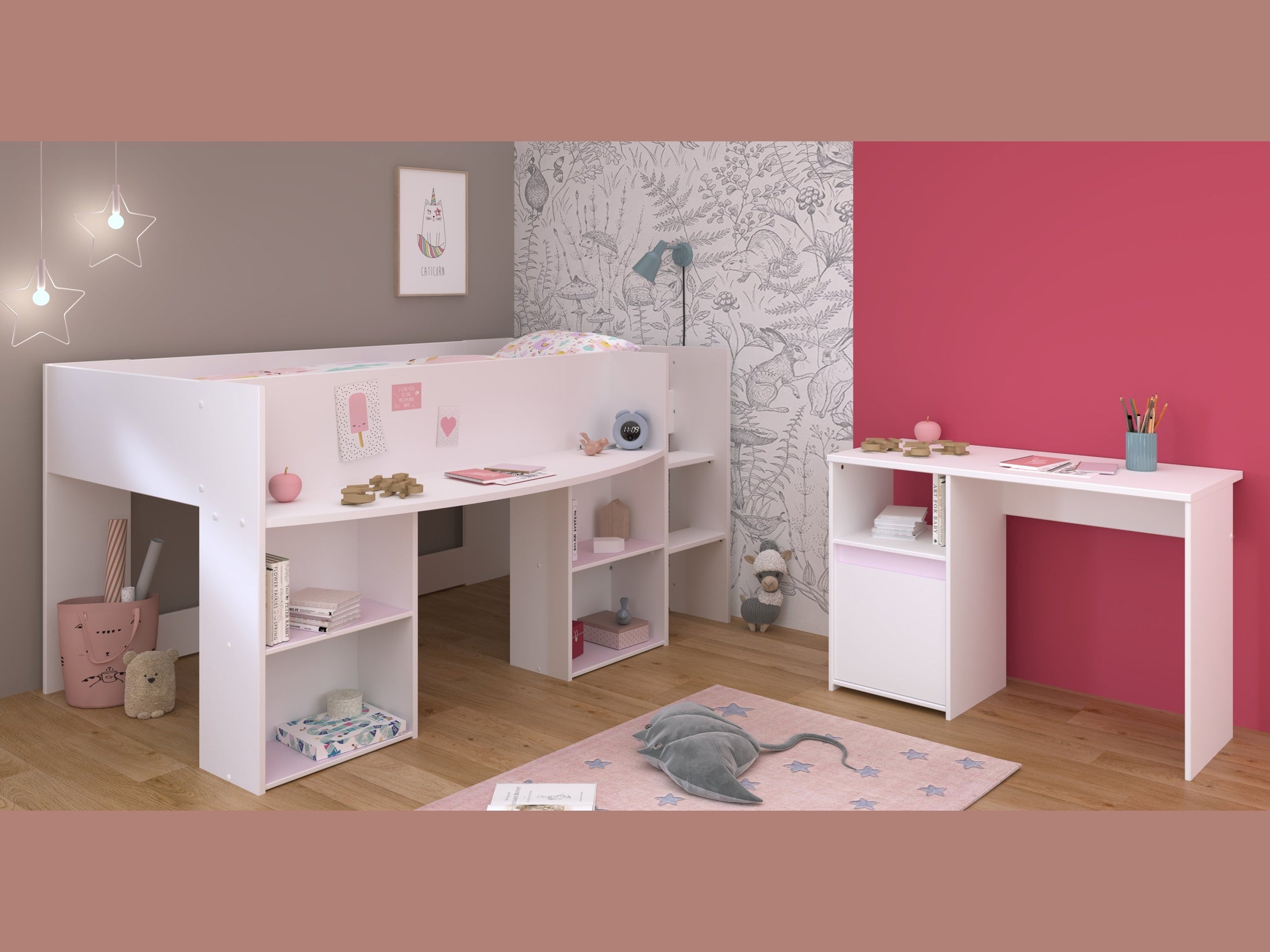 Das Kinder- und Jugendzimmer Parisot Pirouette 17 vereint modernes Design mit durchdachter Funktionalität – ideal für platzsparendes Wohnen im Kinderzimmer. Das Set besteht aus einem kompakten Hochbett mit 90 x 200 cm Liegefläche und einem passenden Schreibtisch, das jungen Schüler*innen einen gemütlichen Schlafplatz und einen funktionalen Arbeitsplatz bietet.