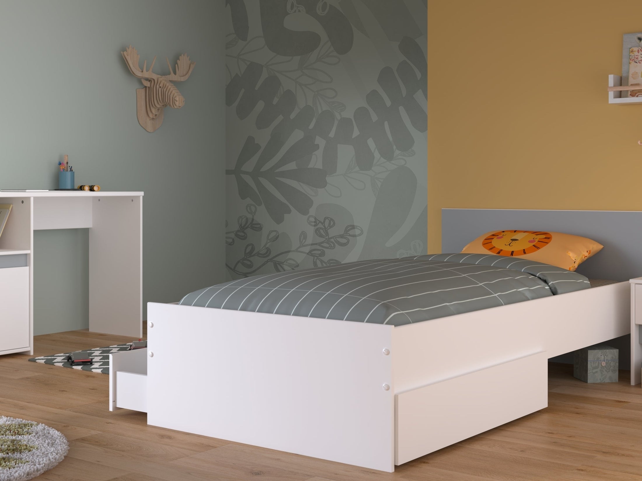 Das Bett (Maße: 203 x 68 x 100 cm) mit einer Liegefläche von 90 x 200 cm bietet nicht nur angenehmen Schlafkomfort, sondern auch praktischen Stauraum. Das im Set enthaltene Bettschubkasten-Set besteht aus zwei separat einsetzbaren Schubkästen (94 x 21 x 42,5 cm), ideal für Spielzeug, Kleidung oder Bettwäsche.