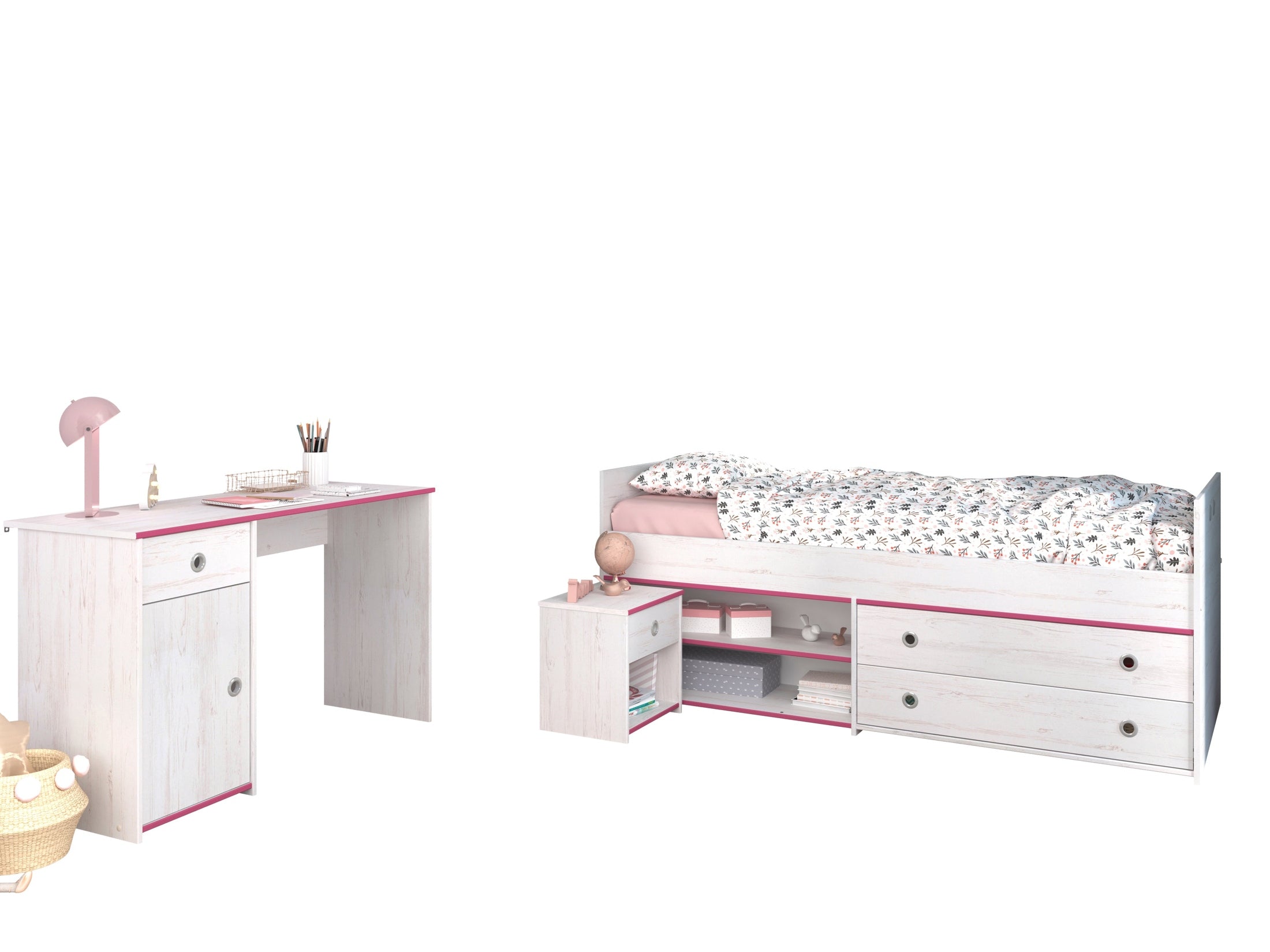Mit dem Kinderzimmer-Set Parisot Smoozy 27 ziehst du Funktionalität und Stil ins Kinderzimmer ein. Die freundliche Kiefer Weiß Nachbildung verleiht dem Raum Helligkeit und Modernität, während die drehbaren Kanten in Pink oder Blau individuell angepasst werden können – perfekt für Mädchen oder Jungen.