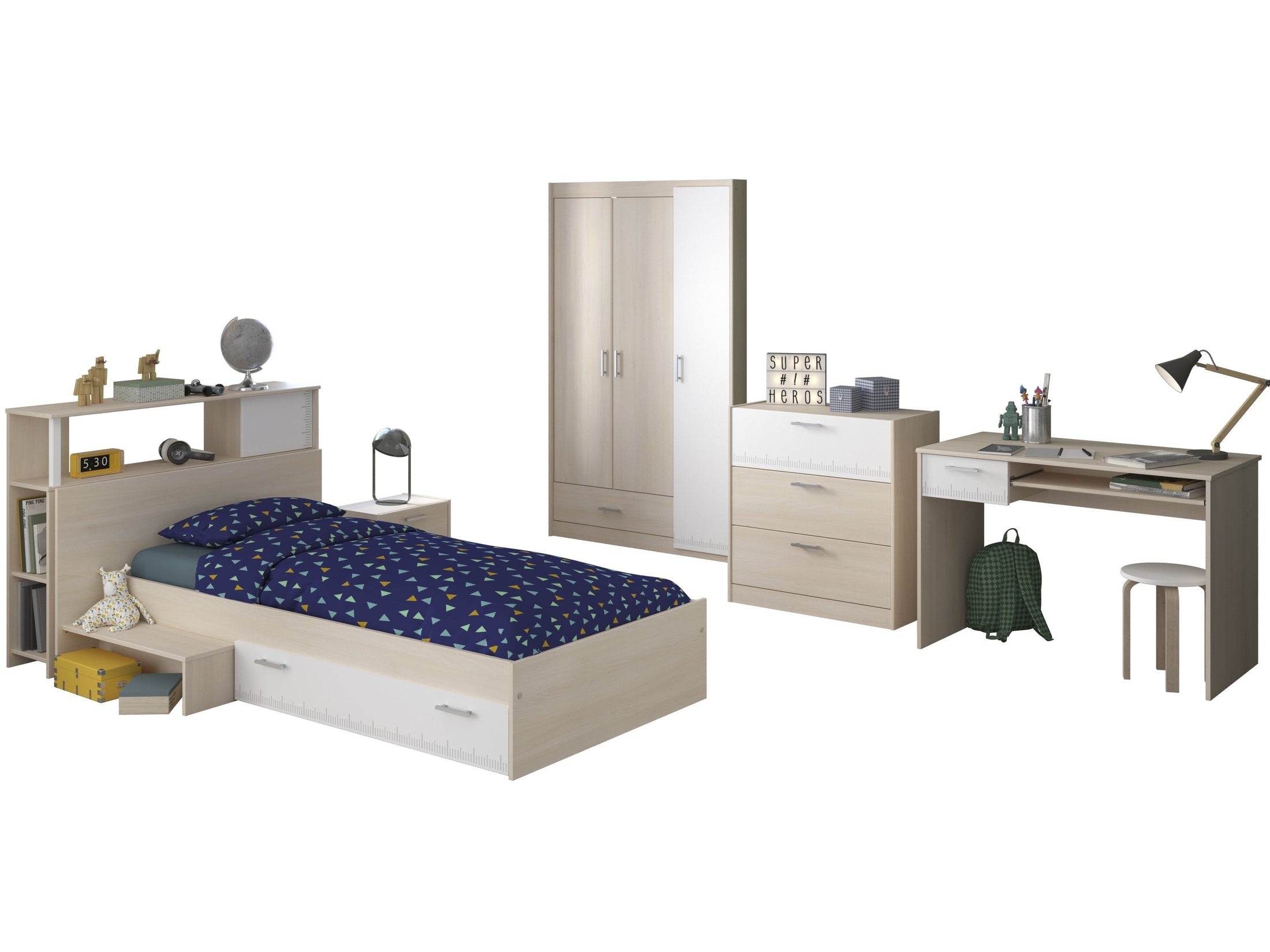 Ob Schlafplatz, Schreibtisch, Stauraum oder Nachttisch – dieses Komplettzimmer bietet für jede Alltagsanforderung die passende Lösung. Jedes Möbelstück ist aufeinander abgestimmt und sorgt gemeinsam für ein stimmiges, kindgerechtes Raumgefühl.