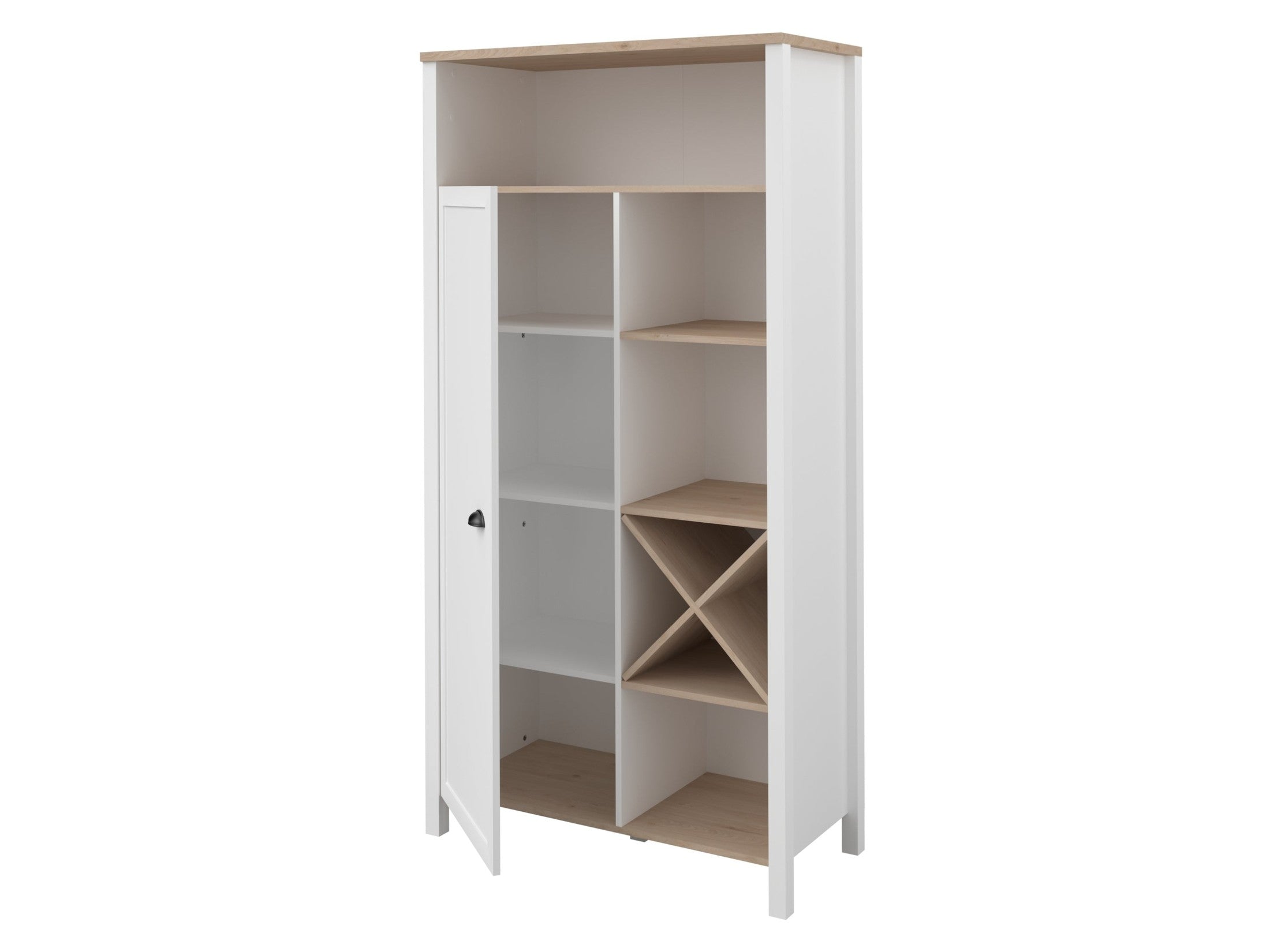 Rechts: 4 offene Fächer, davon ein Fach mit praktischem Flaschenregal-Einsatz – perfekt für Wein oder Ölflaschen