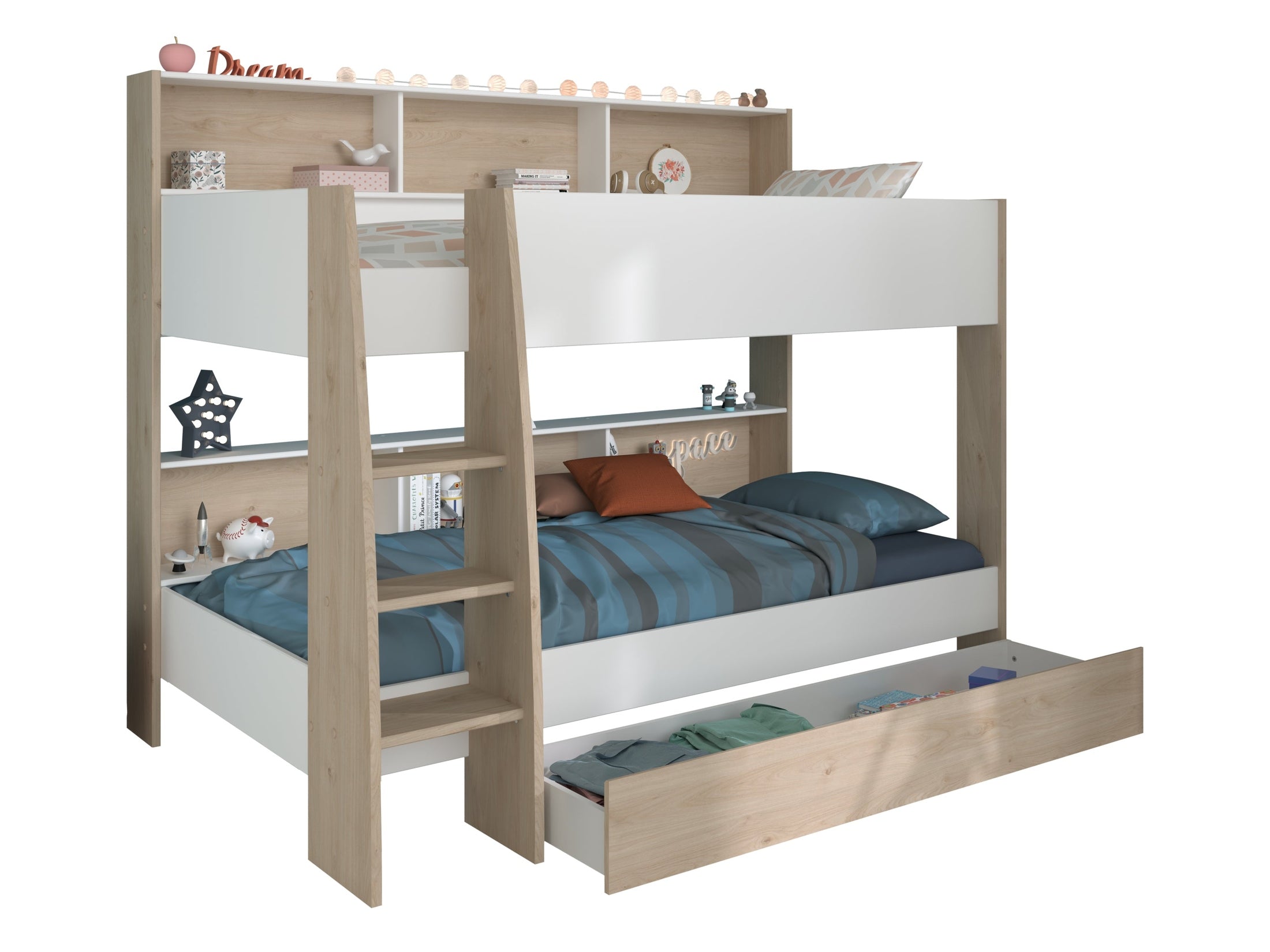 Das moderne Dekor in Jackson Eiche Nachbildung kombiniert mit Weiß verleiht dem Bett eine helle, freundliche Optik und passt perfekt in zeitgemäße Kinder- und Jugendzimmer.