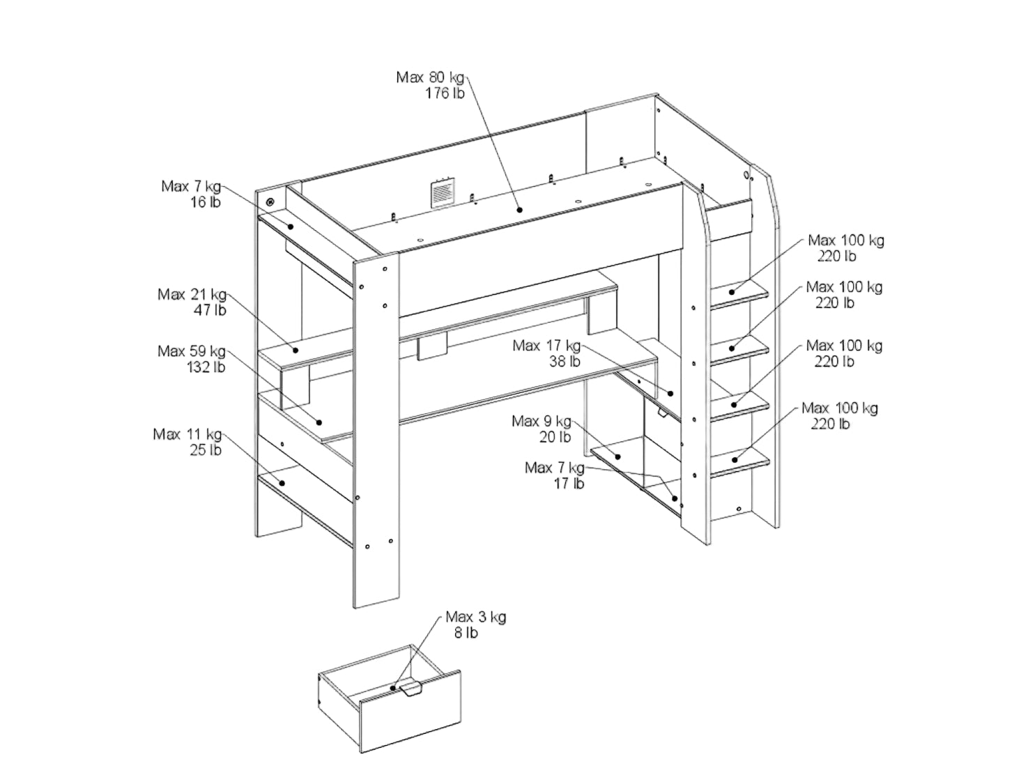 Die erhöhte Liegefläche (90 x 200 cm) ist mit einer belüfteten Spanplatte (Belastbarkeit 80Kg) ausgestattet, sodass kein zusätzlicher Lattenrost benötigt wird. Eine integrierte Leiter mit einer Belastbarkeit von bis zu 100 kg sorgt für einen sicheren Aufstieg.