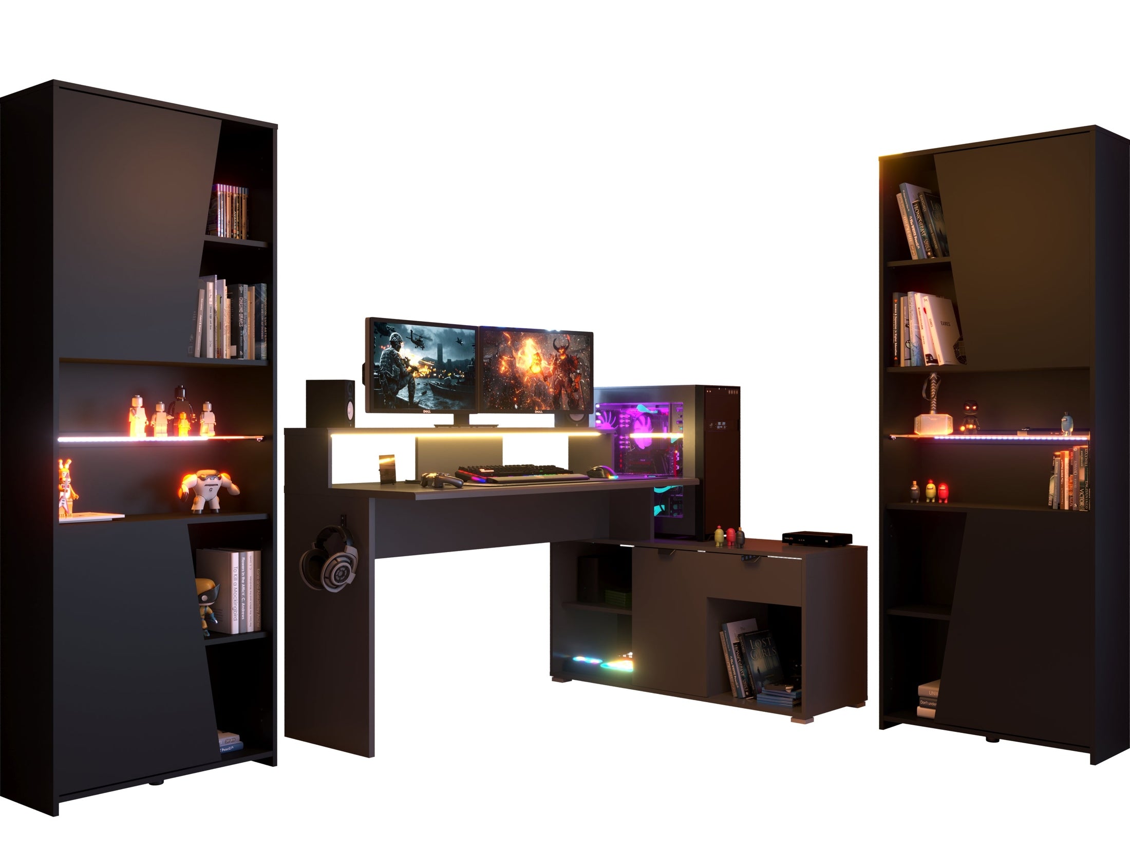 Ergänzt wird es durch zwei Regale mit viel Stauraum, Glas-Einlegeboden und LED-Akzentbeleuchtung – ideal für Games, Zubehör, Technik oder Deko.