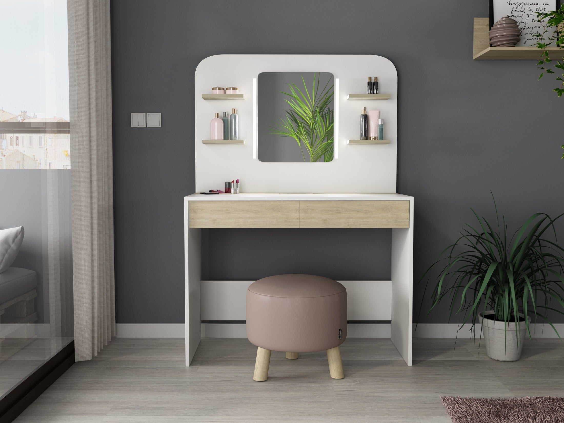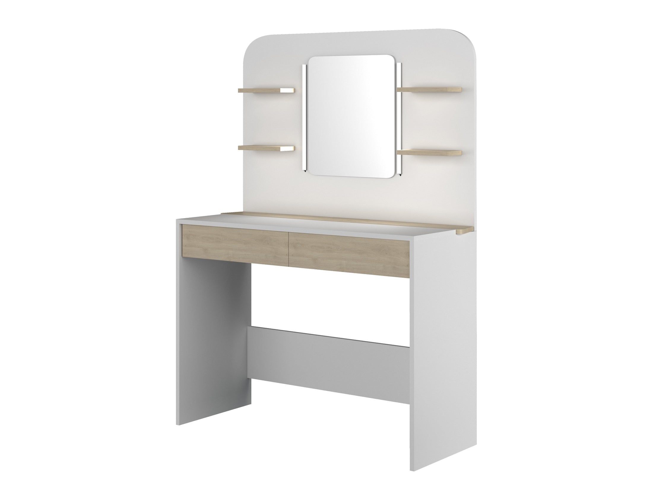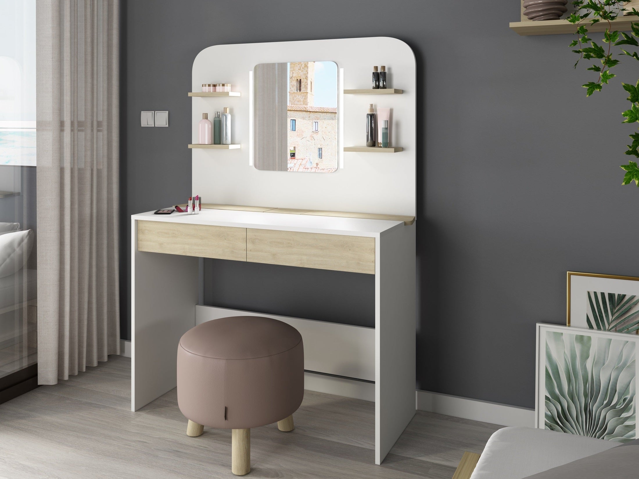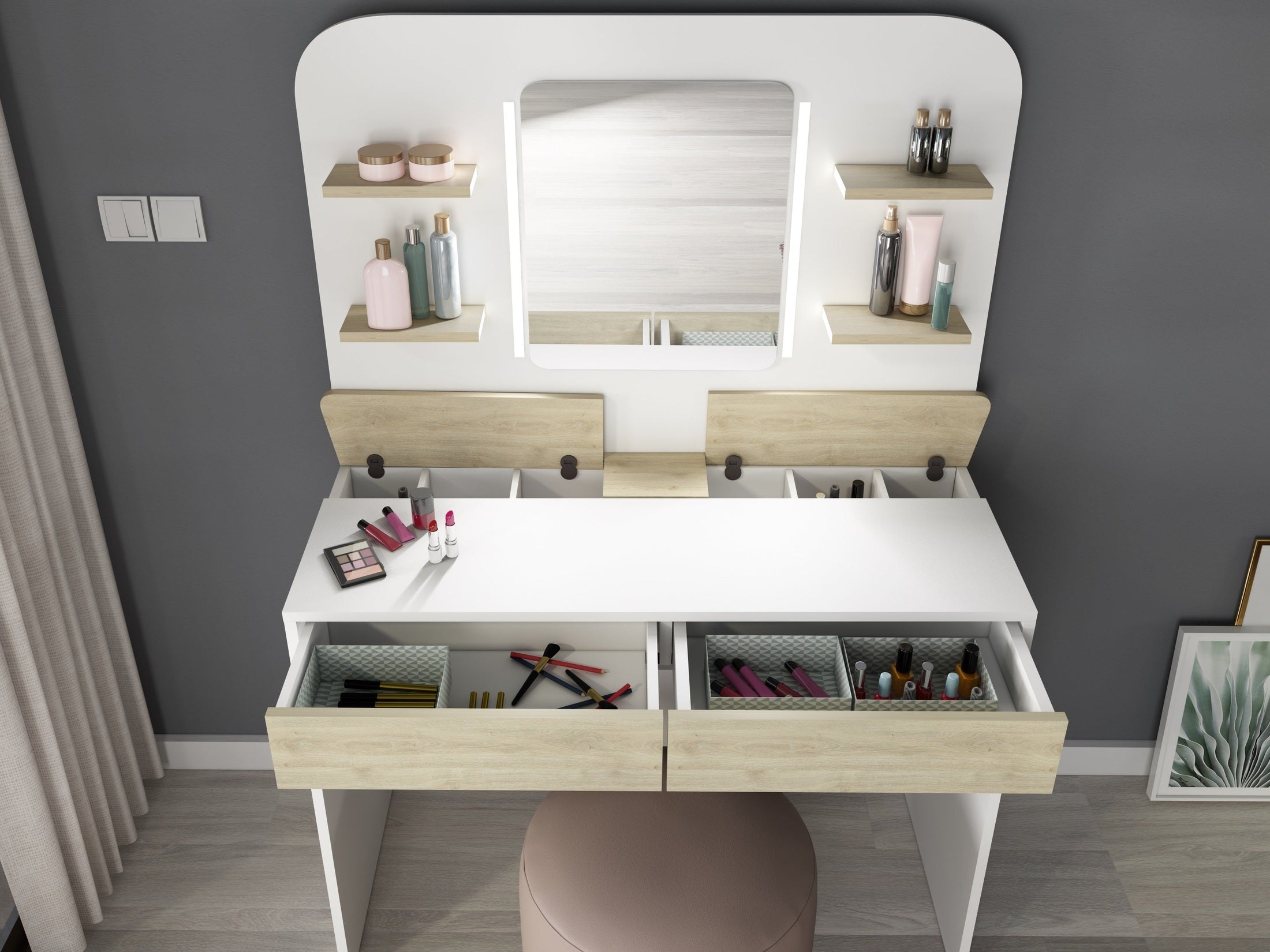Der Schminktisch aus der Kollektion Secret kombiniert modernes Design mit cleverem Stauraum und integrierter LED-Beleuchtung. Die elegante Gestaltung mit abgerundeter Front fügt sich harmonisch in Schlafzimmer, Jugendzimmer oder Ankleidebereiche ein.