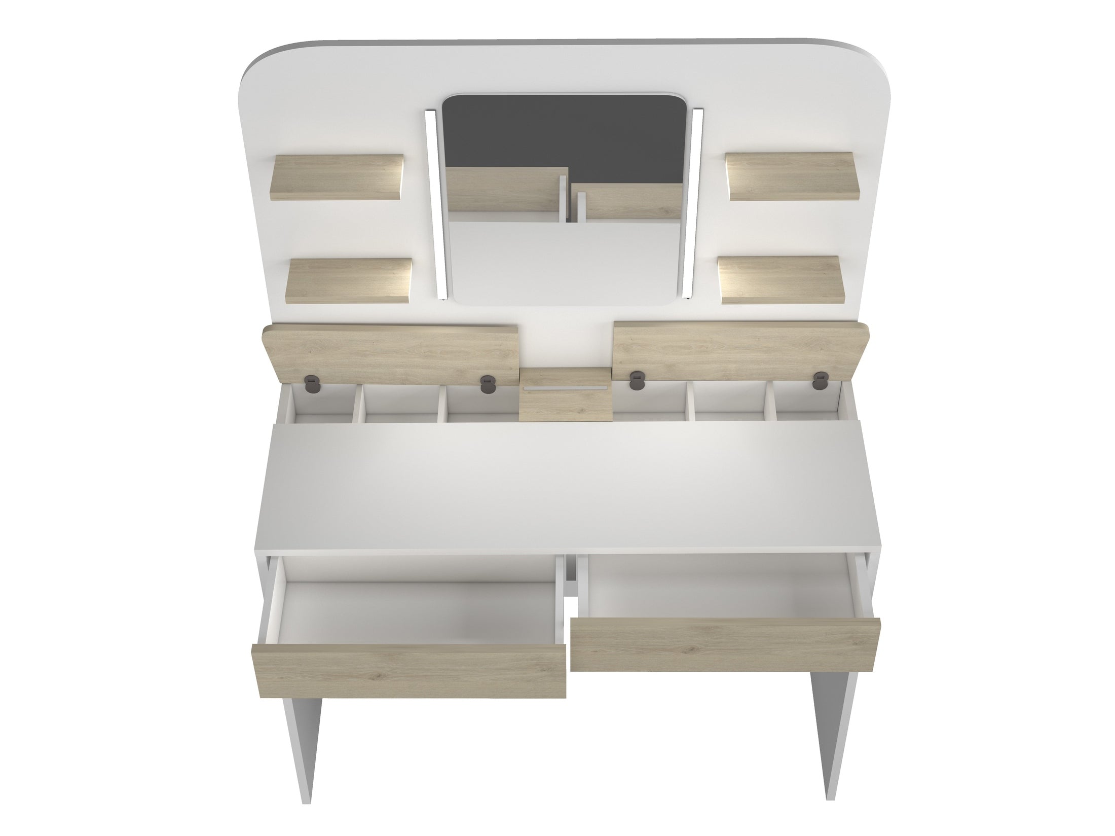 Unter der Tischplatte befinden sich zwei Schubladen mit stabilen Metallführungen. Zusätzlich verfügt der Schminktisch über zwei versteckte Staufächer mit unterteilten Innenbereichen, die leicht zugänglich sind und diskreten Stauraum für Schmuck oder Kosmetik bieten. Vier zusätzliche Ablageflächen schaffen Platz für größere Produkte oder Dekoration. Eine rutschfeste Leiste hält mobile Geräte sicher an ihrem Platz.