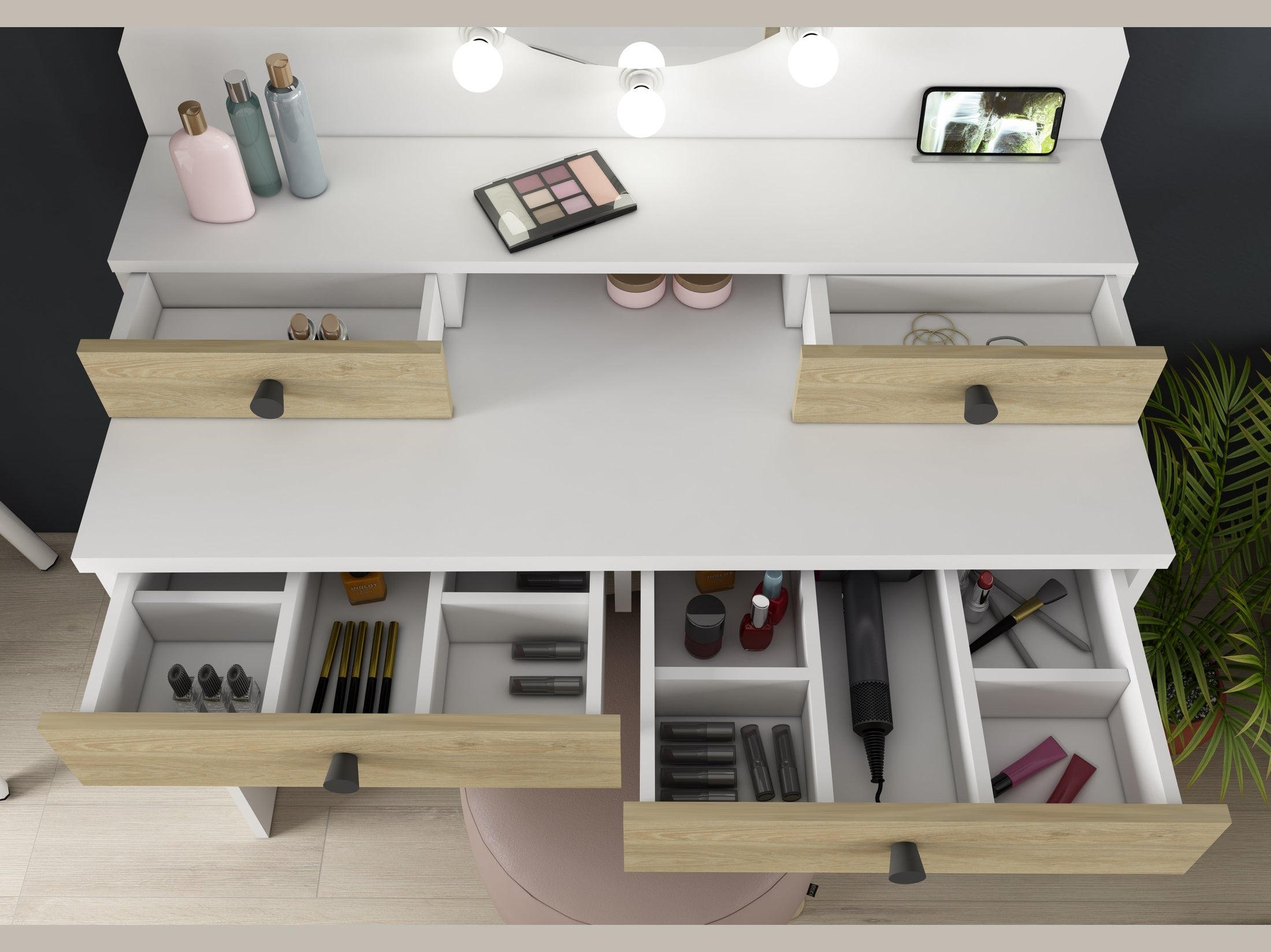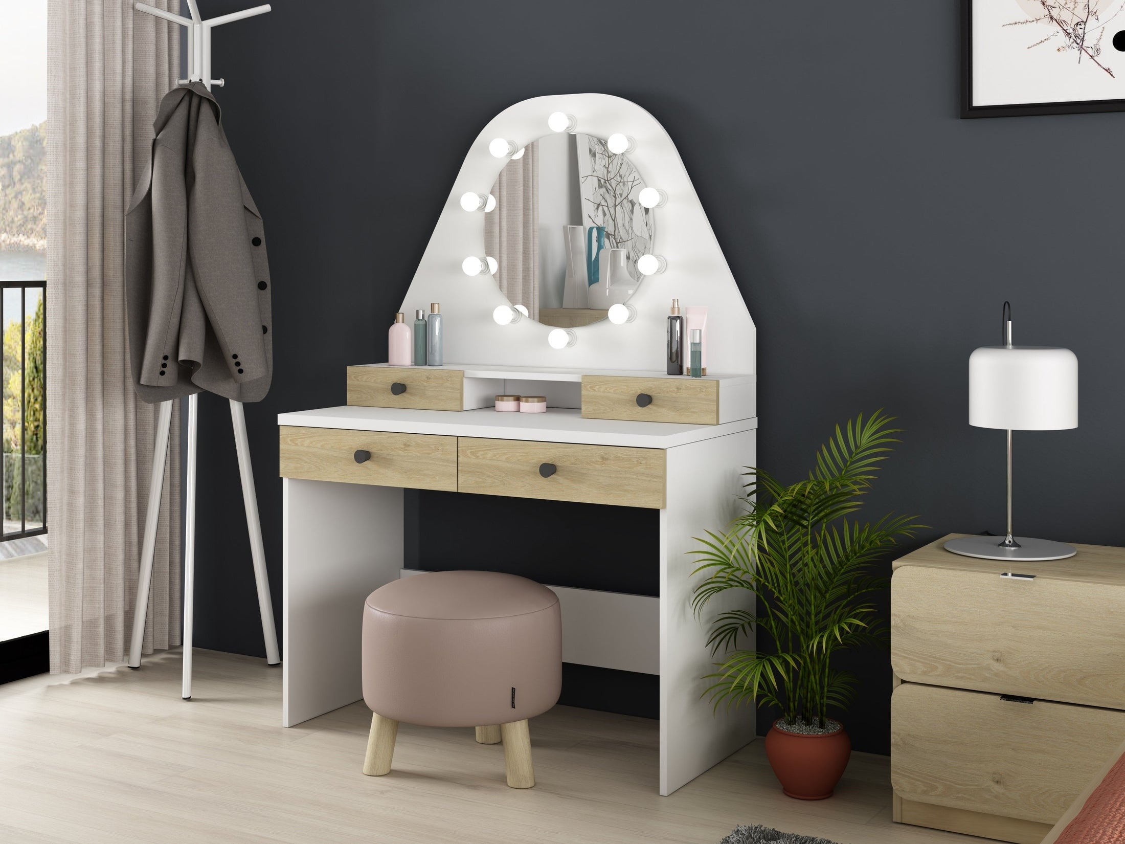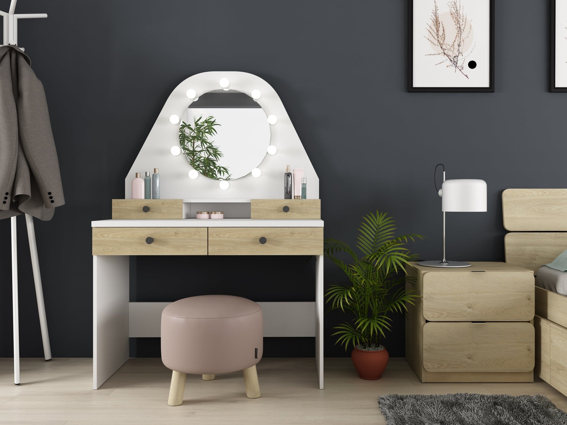 Der Schminktisch aus der Serie Star vereint elegantes Design mit funktionaler Ausstattung und integrierter LED-Beleuchtung. Mit seiner modernen Optik und den verschiedenen Farbvarianten eignet er sich ideal für Schlafzimmer, Jugendzimmer oder Ankleidebereiche.